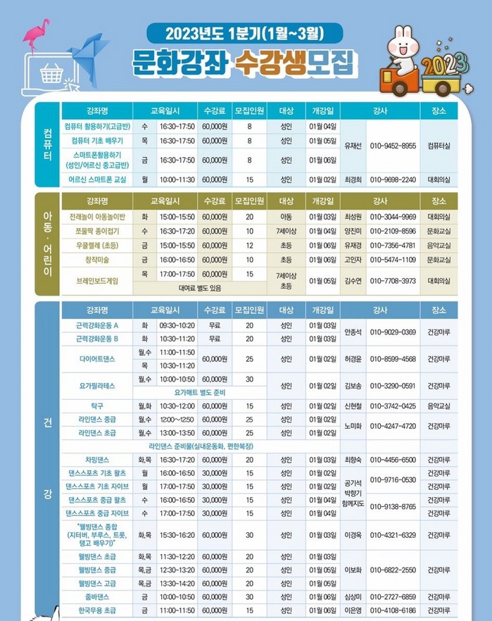 이번 강좌에는 △취미 △어학 △가요‧악기 △컴퓨터, 건강 등 40여개 강좌가 개강하였으며, 지난 2022년 4분기엔 없었던 △스마트폰 활용하기 △한글서예 등의 강좌가 눈에 띈다.