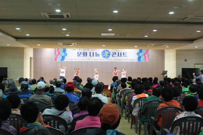 1부 문화나눔 효(효) 콘스트는 최형식 군수의 인사말씀을 시작으로 담양 남초등학교 학생들의 댄스, 율동, 연극('함사세요'), 담양군복지재단 김용 이사장 부부와 센스음악동아리의 색소폰 공연이 펼쳐져 어르신들의 마음에 행복을 가득 전하였다.