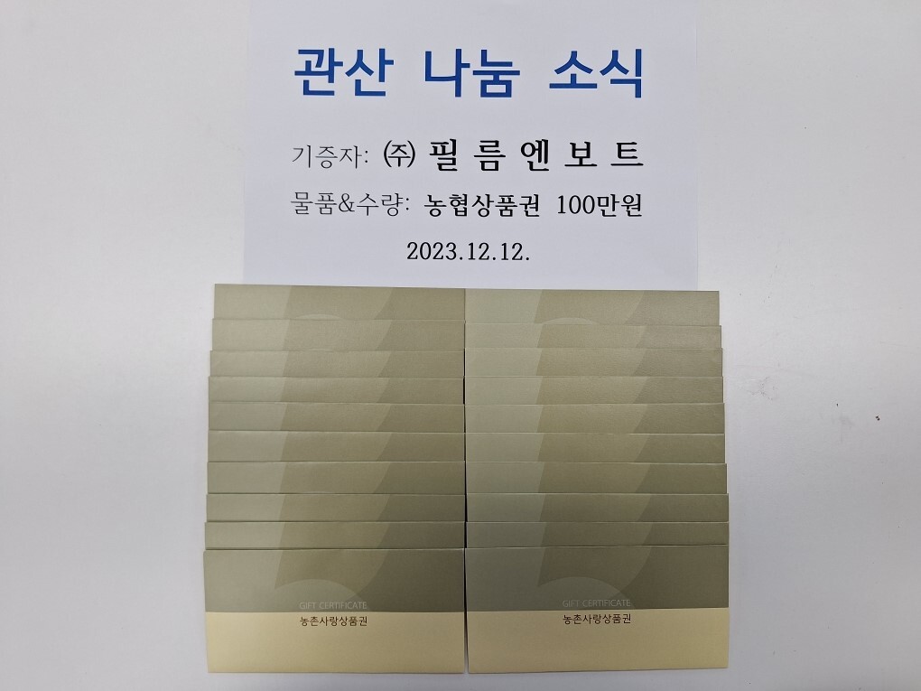 ㈜필름엔보트는 매년 관산동에 기부하고 있는 업체로, 지난해에 이어 올해도 관산동의 어려운 이웃들에게 도움이 되고자 하는 마음으로 상품권을 기부했다.