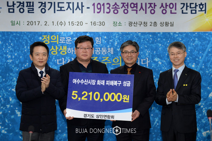 | △경기도상인연합회는 2월1일 광산구청에서 여수수산시장 화재피해복구 성금을 전남상인연합회에 전달했다(왼쪽부터 남경필 경기지사, 봉필규 경기도상인연합회장, 한승수 전남도상인연합회장, 민형배 광산구청장) |