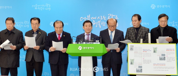 윤장현 광주광역시장, 장휘국 광주광역시죠육감 등 518역사왜곡대책위원들이 1일 오후 광주시정 5층 브리핑룸에서 국정역사교과서 철회를 요구하는 기자회견을 하였다.