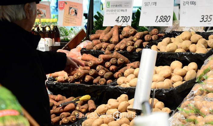 9일 서울의 한 대형마트에서 소비자가 가격이 오른 당근과 감자를 바라보고 있다. 당근은 1kg 기준으로 2배 이상 올라 6천 원을 기록하고 감자 1kg의 가격이 지난주보다 50% 가량 오르는등 농산물 가격이 폭등하고 있다. 2017.01.09