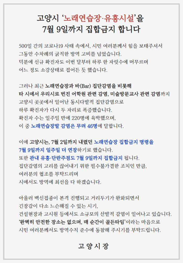 지난 30일 시에 따르면, 고양시(이재준 시장)는 코로나19 확산 차단을 위해 관내 노래연습장과 유흥시설을 대상으로 집합금지 행정명령을 7월 9일까지 발령했다. 대상은 관내 노래연습장 548개소와 유흥시설(유흥·단란주점) 181개소다.