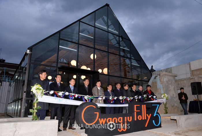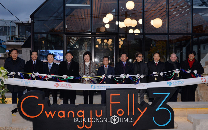 윤장현 광주광역시장이 10일 오후 동구 산수동에 들어선 광주폴리 3차 프로젝트 쿡(COOK) 폴리 개막식에 참석해 이은방 광주시의회 의장, 박양우 광주비엔날레재단 대표, 천득염 광주폴리시민협의회 회장, 천의영 제3차 광주폴리 총감독 등 주요 내빈들과 테이프커팅을 하고 있다.
