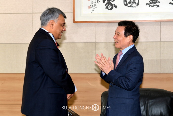 △윤장현 광주광역시장은 마힌드라 코리아 딜립 순다람 사장을 접견하고 전기자동차 등 상호 관심 분야를 논의했다