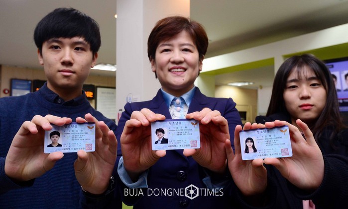 10일 종로구 청운효자동 주민센터에서 강은희(가운데) 여성가족부 장관과 학생들이 교통카드와 선불결제 기능을 갖춘 새로운 청소년증을 들어 보이고 있다. 여성가족부는 새 청소년증을 11일부터 전국 읍면동 주민센터에서 무료 발급된다고 밝혔다. 2017.01.11