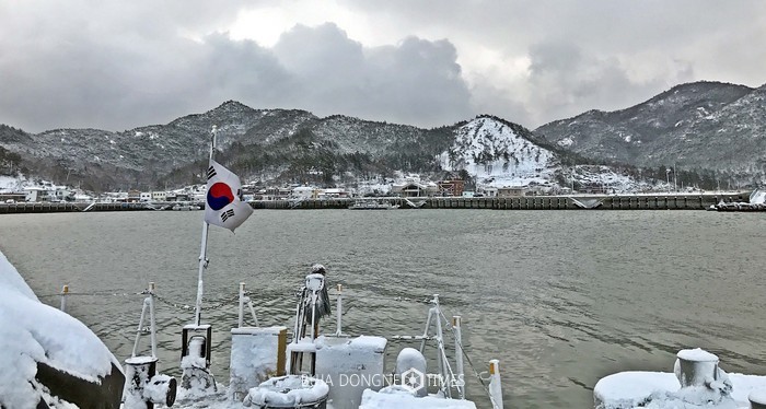 많은 눈이 내린 23일 오전, 전북 부안군 앞바다에서 해양사고 예방을 위해 근무 중인 부안해양경비안전서 소속 112정(정장 남민우)에서 바라본 섬 위도(蝟島)의 설경이 아름답다. 2017.01.24. (사진= 112정 김영성 경장 제공)