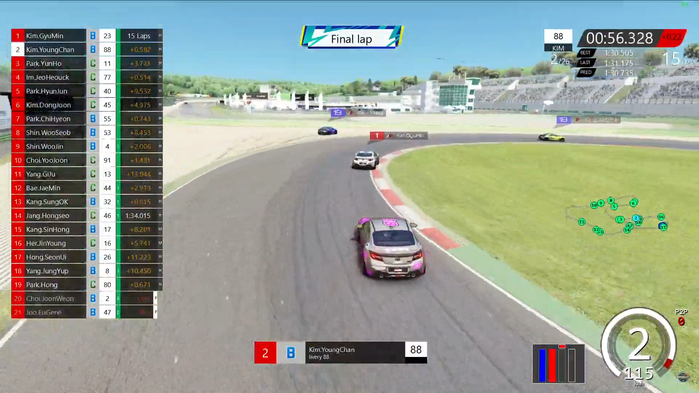 10 LAP에서 김영찬(21) 선수가 김규민(20) 선수 뒤에 바짝 따라붙으면서 기회를 노려보았으나 김규민(20) 선수의 블로킹에 의해 실패했다. 11 LAP에서 한번 더 기회를 노려본 김영찬(21) 선수는 순간적으로 진행 방향을 틀면서 김규민(20) 선수를 완벽하게 속여 순식간에 1위로 올라서는 모습을 보여주었다. 중계진은 김규민(20) 선수도 사람이라며 김영찬(21) 선수의 전략에 감탄하였다.
