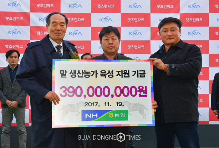 이날 대회에 참석한 이경섭 농협은행장은 국내 말 생산농가 육성 지원기금으로 총 3억9천만원을 한국경주마생산자협회 및 한국내륙말생산자협회에 전달하고 농협이 국내 말 생산농가와 축산 발전에 앞장서겠다고 말했다.
