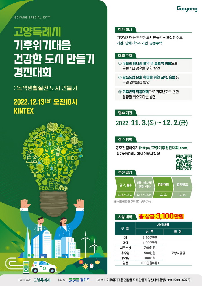 이번 경진대회는 온실가스 감축과 탄소중립 생활실천을 주도한 전국의 기관·단체·학교·기업·공동주택이 참여할 수 있다. 수상 기관에는 총 상금 3,100만원과 고양시장상이 주어지며 입선작은 전국의 지방자치단체에 사례를 공유해 기후변화대응 정책으로 확산될 수 있도록 할 계획이다.