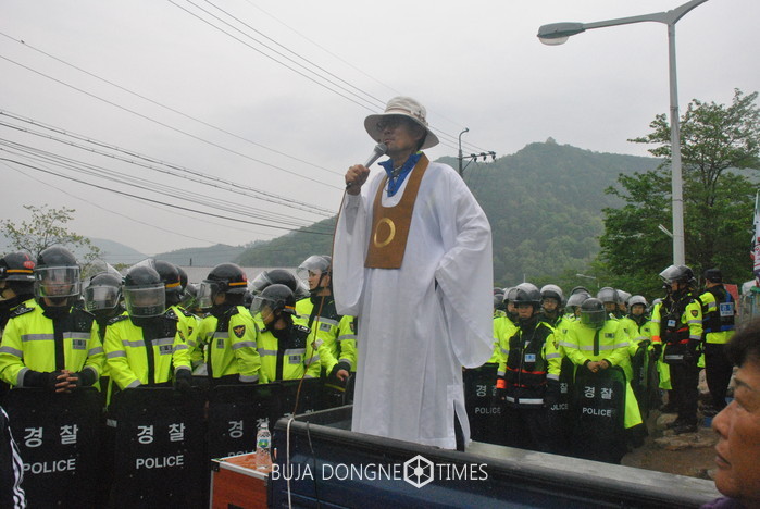 주민들은 소성리 마을회관 앞에서 집회를 열고 "합법적으로 신고된 집회를 경찰이 불법적으로 막고 있다"며 강하게 반발하고 있다.