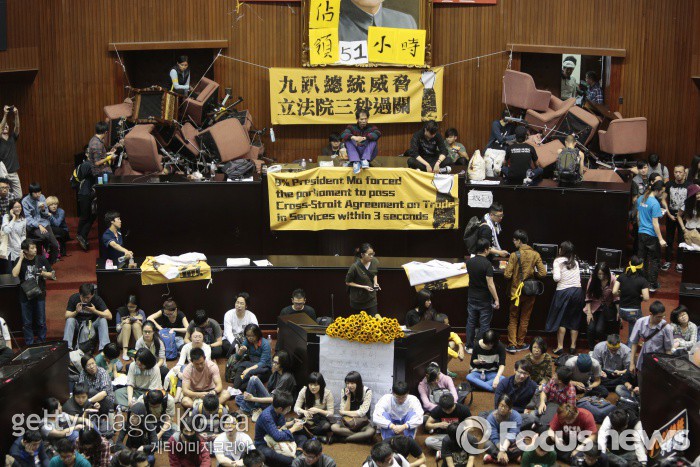 | △ (타이베이/대만=게티/포커스뉴스) 지난해 3월 19일 대학생 등 시위자들이 대만 입법원을 점령하고 양안서비스무역협정을 강행 처리한 국민당에 항의하고 있다. ⓒ게티이미지/멀티비츠 photo@focus.kr |