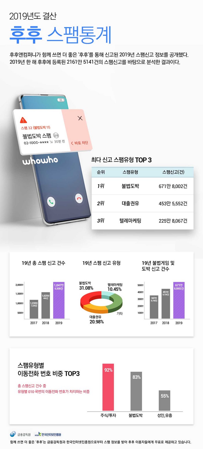 [부자동네타임즈 이교영 기자]후후앤컴퍼니가 스팸차단 앱 ‘후후’를 통해 2019년 한해 동안 이용자들이 신고한 스팸 건수 통계를 공개했다.