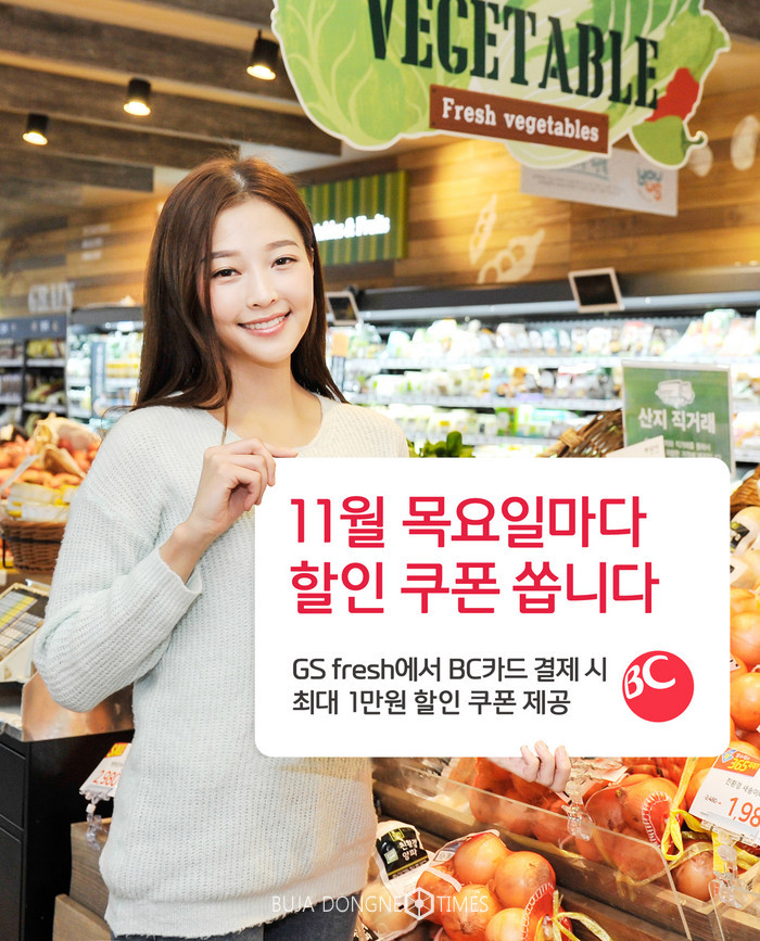 11월 30일까지 매주 목요일(16, 23, 30일) GS fresh 홈페이지에서 이벤트에 응모한 고객 중 BC카드로 결제한 고객을 대상으로 진행되며, 결제 금액에 따라 ▲ 5천원 할인쿠폰(5만원 이상 결제 시) ▲ 1만원 할인쿠폰(10만원 이상 결제 시)이 제공된다.