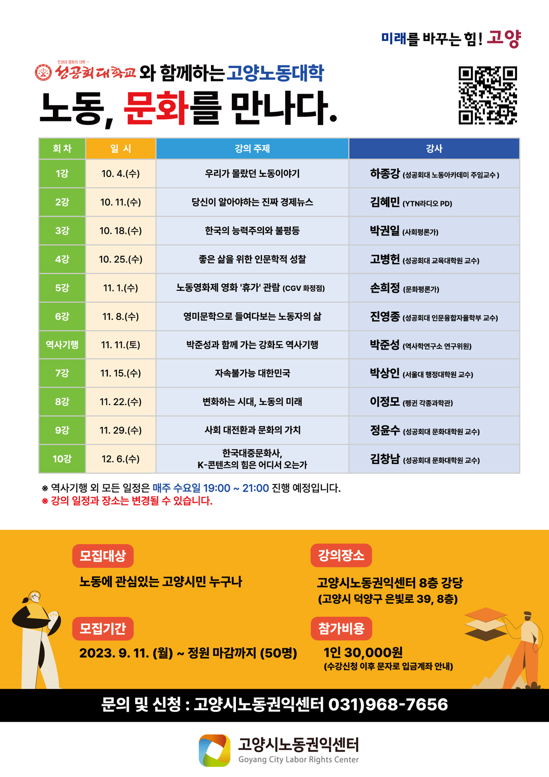 고양노동대학은 다양한 노동 문제를 노동자의 관점으로 분석하고 수강생들이 자발적인 토론을 통해 스스로 배우고 성장하는 인문학 교육이다. 올해는 ‘노동, 문화를 만나다’라는 주제로 10월 4일부터 12월 6일까지 매주 1회 총 11강이 진행될 예정이다. 강의 외에도 노동영화 관람, 강화도 역사기행 프로그램도 진행된다.
