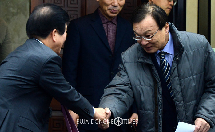 16일 오전 서울 여의도 국회에서 열린 더불어민주당 의원총회에서 박병석(왼쪽) 의원과 이해찬 의원이 인사를 나누고 있다. 2017.02.16.