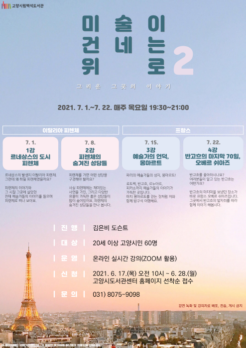 도서관 담당자는 “코로나19 장기화로 해외여행을 하지 못하는 시민들이 이번 미술 여행을 통해 치유와 즐거움의 시간을 보내시길 바란다”고 말했다.