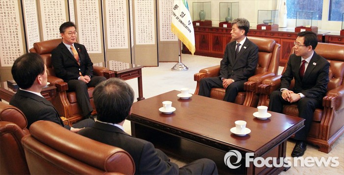 △ 11일 오전 서울 종로구 남북회담본부에서 홍용표(왼쪽 두번째) 통일부 장관이 남북당국회담 대표단을 격려하고 있다. <ㅅ진제공=포커스뉴스>