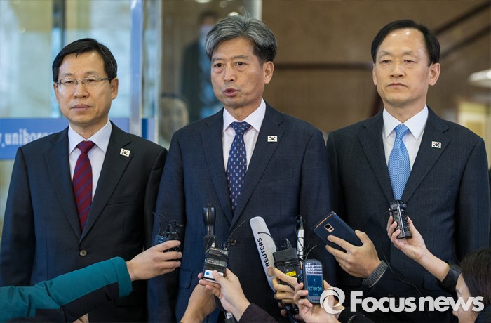 △ 11일 오전 서울 종로구 남북회담본부에서 황부기(가운데) 통일부 차관이 남북당국회담을 출발하기 전 취재진의 질문에 답하고 있다.