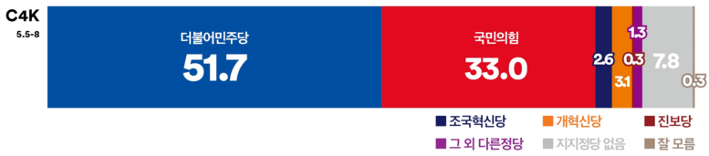 권역별로는 서울(48.6%), 경인권(56.8%), 충청권(49.3%), 강원·제주(48.9%) 등 대부분의 지역에서 ‘더불어민주당’이 우위를 점했다. 특히 호남권에서는 76.6%로 압도적인 지지를 얻었다. 반면 ‘국민의힘’은 대구·경북에서 52.7%의 지지율로 더불어민주당(33.1%)을 19.6%p 앞서며 유일한 강세 지역을 기록했다. 부·울·경 지역에서는 양당의 지지율이 비슷하게 나타났다.