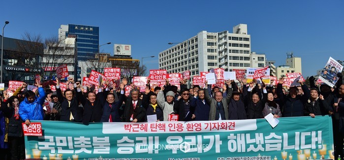 | △장휘국 교육감은 10일(금) 오전 5·18민주광장에서 윤장현 생중계로 헌법재판소 탄핵심판 결과를 윤장현 시장과 임추섭 대표, 정영일 대표 등 시민들과 함께 지켜봤고 탄핵 인용 선고가 나오자 환영 기자회견을 갖었고 기념촬영을 하고 있다. |