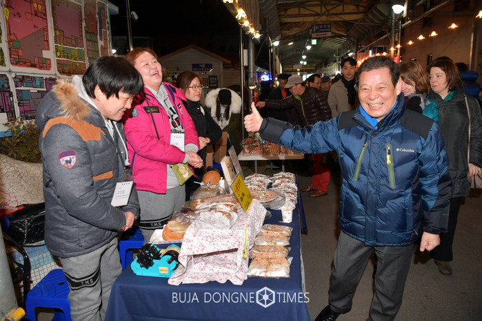 | △윤장현 광주시장이 18일 저녁 올해 첫 개장한 대인예술야시장을 찾아 상가를 둘러보고 상인들을 격려하고 있다 |