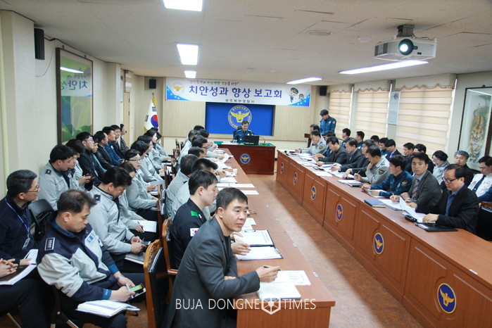 | △광주북부경찰서는 3월 24일 서장, 각 과장, 계장 및 지구대장 등 참석 '치안성과 향상 보고회'를 개최했다 |