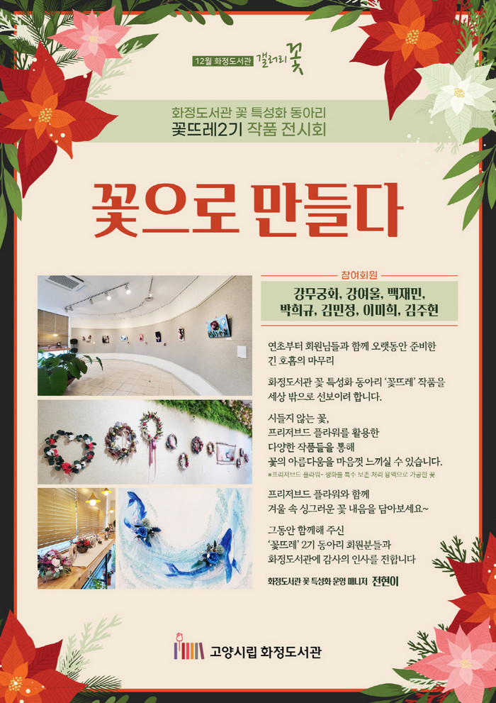 화정도서관 꽃 특성화 동아리 ‘꽃뜨레’는 이번 전시회를 통해 크리스마스 리스 등 연말 느낌이 물씬 나는 작품들을 선보인다. 헤엄치는 고래와 나비의 날갯짓을 표현한 작품도 눈길을 끈다.