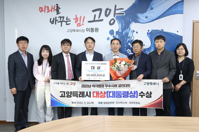 [부자동네타임즈 김인수기자] 고양특례시(시장 이동환)가 행정안전부·인사혁신처·국무조정실이 공동 주관한 2022년 적극행정 우수사례 경진대회에서 영예의 대상인 대통령상을 수상해 특별교부세 5천만원을 확보했다. 이로써 시는 범정부 ‘적극행정 우수사례 경진대회’에서 3년 연속 수상하는 쾌거를 이뤘다.