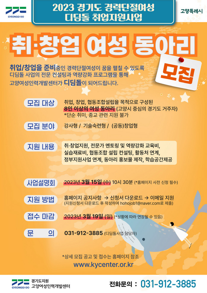 [부자동네타임즈 김인수기자] 경력단절여성의 취·창업을 지원한다. 고양여성인력개발센터는 경기도와 고양시의 지원을 받아 2023년 ‘경력단절여성 디딤돌 취업지원 사업’에 참여할 여성 취·창업 동아리를 모집한다고 전했다.