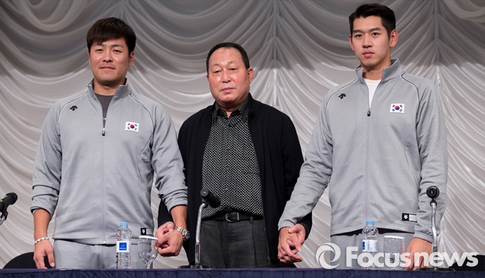 △ 지난달 26일 오후 서울 금천구 시흥대로 바로가기노보텔 앰배서더 독산에서 열린 2015 WBSC 프리미어12 국가대표팀 공식 기자회견에서 강민호(왼쪽부터), 김인식 감독, 이대은이 기념촬영을 하고 있다. 김인철 기자 yatoya@focus.kr