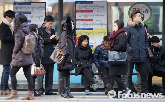 (서울=포커스뉴스) 서울 아침 최저기온이 영하5도 내려간 4일 오전 서울 강남구 강남역 인근 버스정류장에서 시민들이 버스를 기다리고 있다.