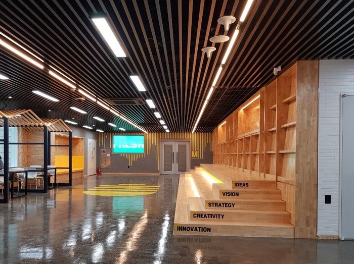 디노스페이스는 열린책공간(Book)-B, 큰모둠방(Discussion Room)-D, 시청각실(Multi-Room)-M, 도시락방(Food)-F, 작은모둠방(Cafeteria)-C, 창업연구공간(Lab)-L, 야외쉼터로 구성했다.