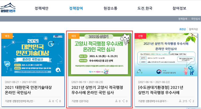 사전 온라인 국민심사는 ‘광화문1번가’ 홈페이지의 국민심사 코너에서 오는 6월 23일까지 진행된다.