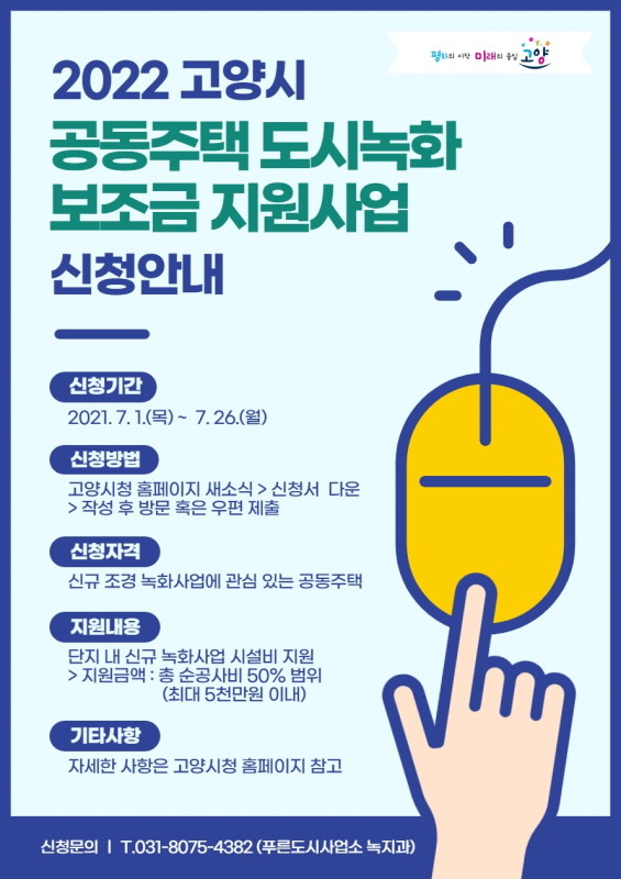 지원을 희망하는 대상 공동주택은 신청서류를 작성해 오는 7월 1일부터 26일까지 고양시청 푸른도시사업소 녹지과 조경팀으로 방문 또는 등기우편으로 신청하면 된다.
