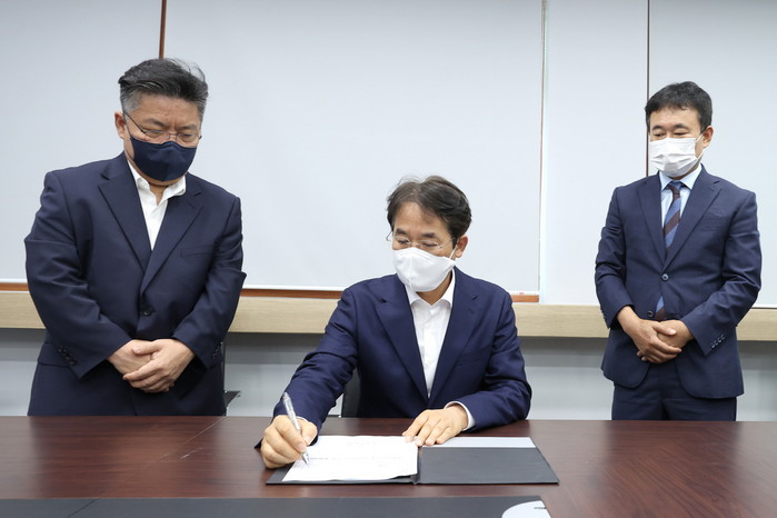 [사진설명] 이동환 고양시장이 ‘경제자유구역 추진단 구성 계획’을 1호 공식문서로 결재하고 있다. (22.7.1.)
