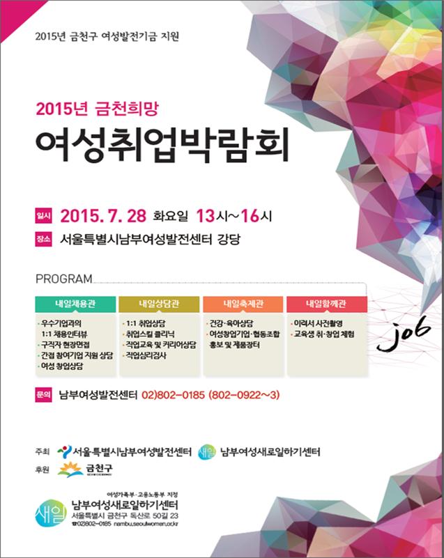 남부여성발전센터 유옥순 소장은 “금천구의 여성발전기금 지원으로 진행되는 이번 박람회를 통해 취업을 희망하는 많은 경력단절여성들이 참여해 취업 기회뿐 아니라 취업에 유익한 정보를 갖고 갈 수 있길 바란다”고 말했ek.