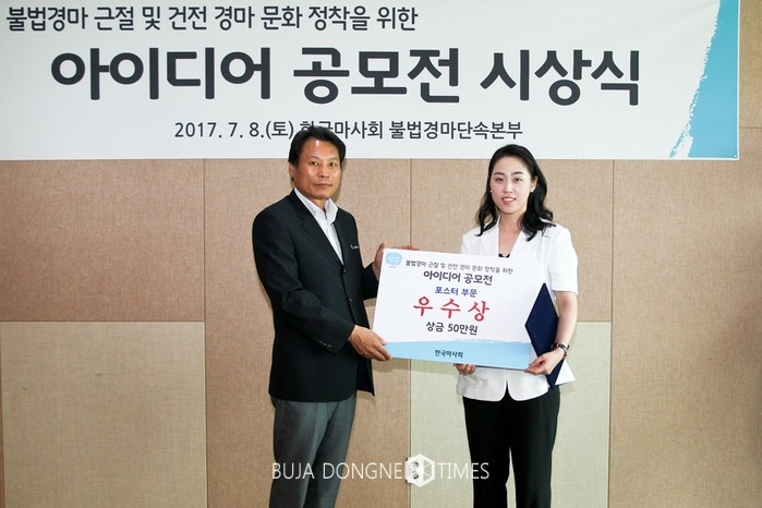 [부자동네타임즈 이채봉 기자]한국마사회 는 지난 7월 8일(토) 렛츠런파크 서울에서 불법경마 근절 아이디어 공모전 시상식을 가졌다. 한국마사회 박양태 경마본부장(불법경마단속본부장 겸)과 수상자 등 15여명이 참석했으며 시상식, 기념촬영 등의 순으로 진행됐다.