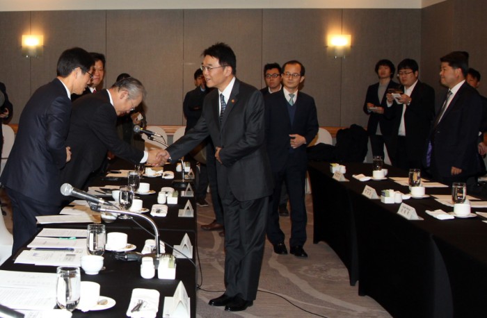 | △ 25일 주택업계 조찬간담회에서 참석자들과 악수를 나누고 있는 강호인 국토교통부 장관 . <사진제공=포커스뉴스> |