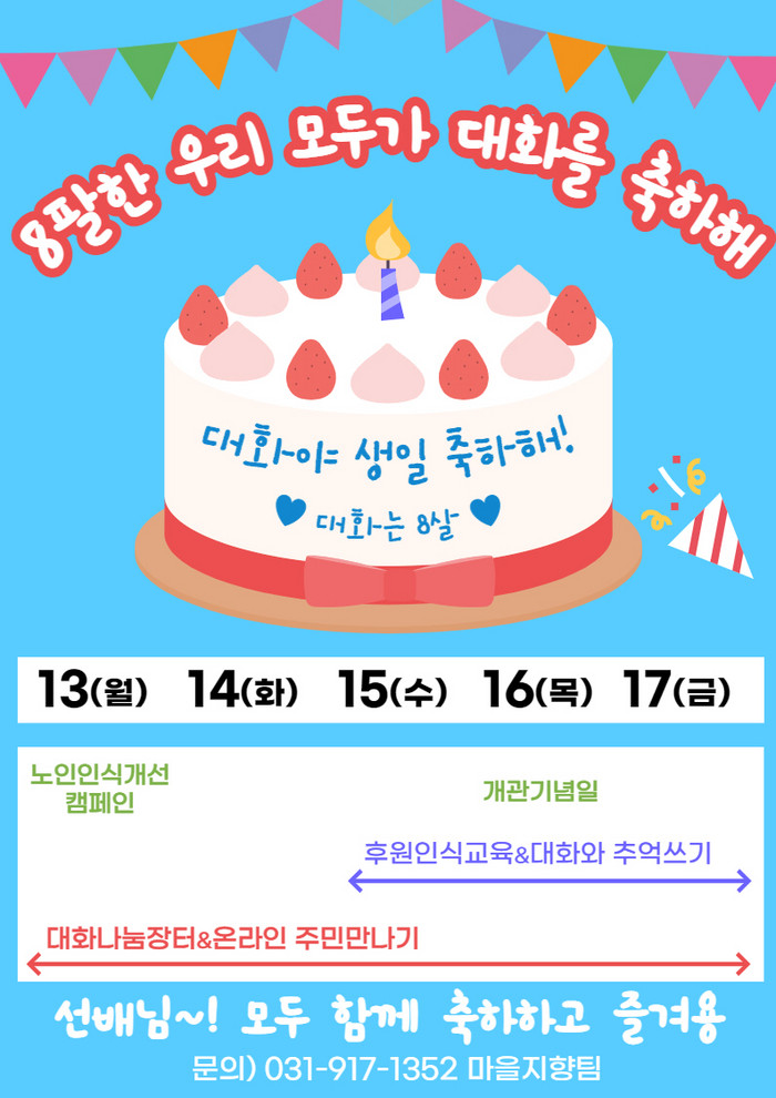 [부자동네타임즈 김인수기자] 고양시대화노인종합복지관이 6월 16일 개관 8주년 기념일을 맞이하여 복지관 회원과 지역주민이 함께하는 ‘8팔한 우리 모두가 대화를 축하해’행사를 진행한다.