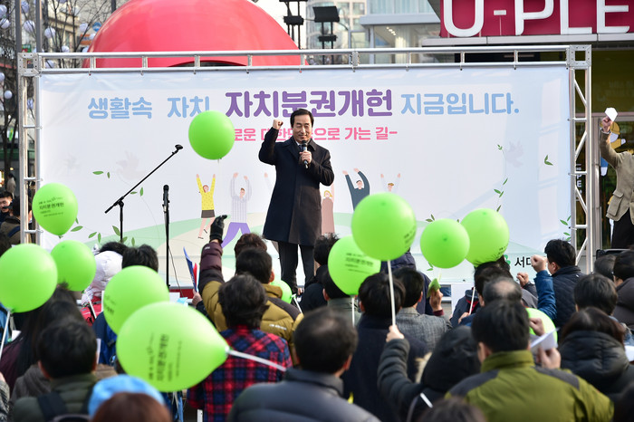 한편 문석진 서대문구청장은 최근 여의도 국회의사당 앞에서 자치분권개헌을 촉구하는 1인 시위 주자로 나서고 지방분권 및 기본권 강화를 위한 개헌촉구 공동선언에 참여하는 등 지난해에 이어 올해도 자치분권개헌에 적극 앞장서고 있다.