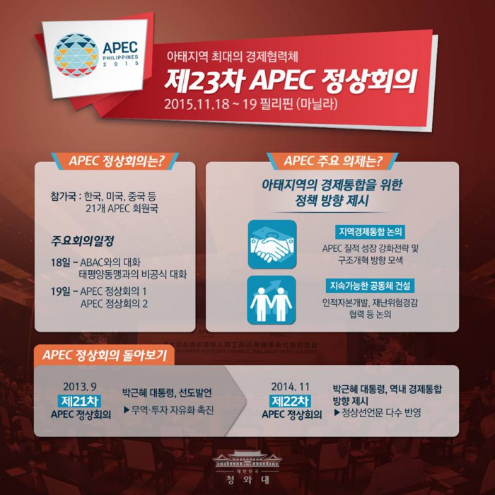 [부자동네타임즈 박윤수 기자] 박근혜 대통령은 19일 오전 9시 30분(현지시각) 필리핀 마닐라에서 제23회 아시아태평양경제협력체(APEC) 정상회의에 참석해 각국 정상들과 기념촬영으로 2일차 공식일정을 시작한다.