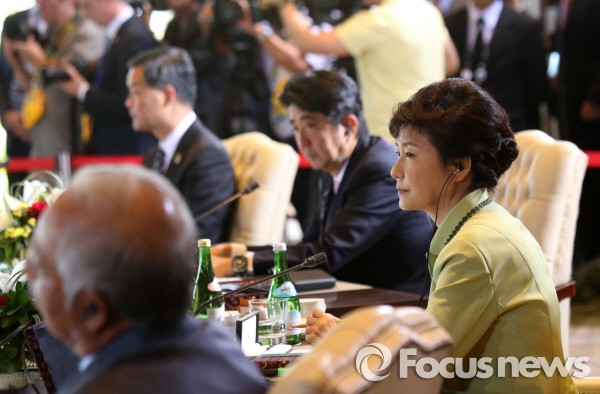 △ 박근혜 대통령은 19일(현지시간) APEC 정상회의 의제1, 정상오찬, 의제2에 참석해 국제사회에서의 포용성 증진에 기여 할 수 있는 우리나라의 다양한 정책사례를 소개한다. 사진은 2013년 APEC 정상회담 1차 세션에 참석한 박 대통령 모습. <사진제공=포커스뉴스> |