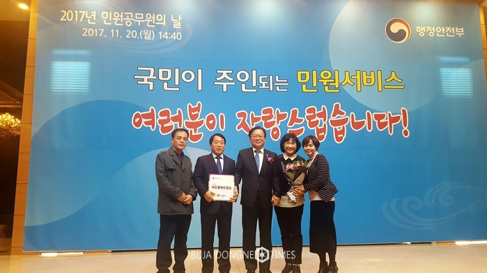 [부자동네타임즈 이병도 기자]성동구가 ‘2017년 국민행복민원실’로 선정되어 지난 20일 대구 라온제나에서 열린 ‘제8회 민원공무원의 날’행사에서 우수기관 표창 및 인증현판을 수여받았다.