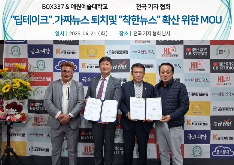 [부자동네타임즈 = 이병도 기자] BOX337(회장 김태복)과 전국기자협회 가짜뉴스퇴치긴급취재단(단장 신상철)이 지난 21일 전국기자협회 사무실에서 딥페이크 및 가짜뉴스로 인한 피해 대응과 공익적 ‘착한뉴스’ 확산을 위한 의미 있는 업무협약을 체결했다.