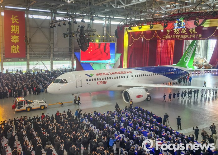 | △ 2일 중국 상하이 상용항공기(COMAC) 푸둥공장에서 중대형 상업용 여객기 C919가 출고식을 갖고 있다. 이 여객기는 항속거리가 4075km로 내년 상반기 시험비행 예정이다. 신화/포커스뉴스 photo@focus.kr |