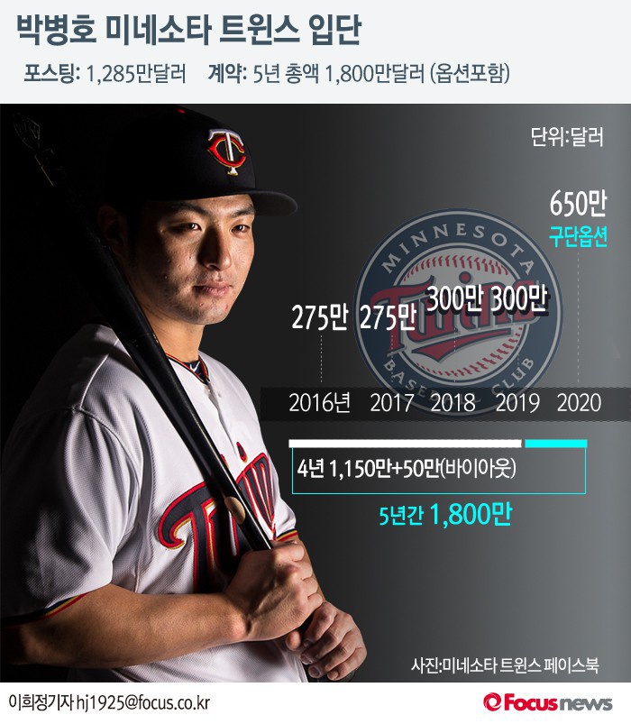 박병호는 미네소타와 2일 4+1년 최대 1800만달러 계약을 체결했다. 4년 동안 1200만 달러(약 137억7700만원)를 보장받는다. 5년째 구단이 옵션을 행사하면 최대 금액은 1800만달러가 된다.
