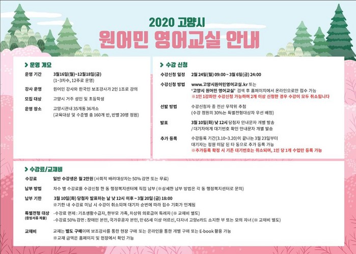 수강신청은 2월 24일부터 3월 6일 오전 9시부터 24시까지 고양시 원어민 영어교실 홈페이지에서 온라인 접수로 진행되고, 전산추첨을 통해 3월 10일 낮 12시에 당첨된 수강생에게 문자로 개별 통보할 예정이다.