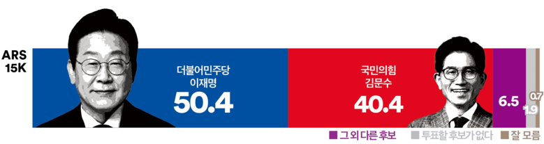 이재명 50.4% vs 김문수 40.4% vs 그 외 다른 후보 6.5% vs 투표할 후보가 없다 1.9%[ 여론조사꽃]