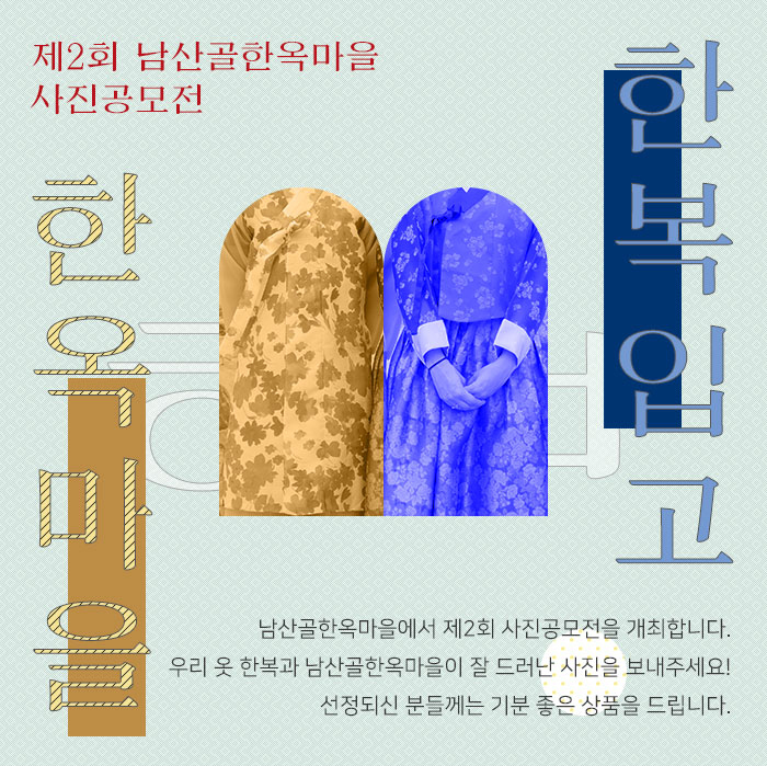 공모전의 주제는 <한복입고 한옥마을>로, 남산골한옥마을을 배경으로 찍은 한복 인물사진이라면 누구나 지원 가능한 열린 공모전이다. 남산골한옥마을은 서울 충무로에 위치한 시민공간으로, 개화기에 지어진 한옥 다섯 채가 전통정원과 어우러져 마을을 이루고 있다.